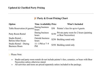 The cost is a $5 painter's fee per person plus the cost of the ceramic you choose. Bear Necessities starting at $25